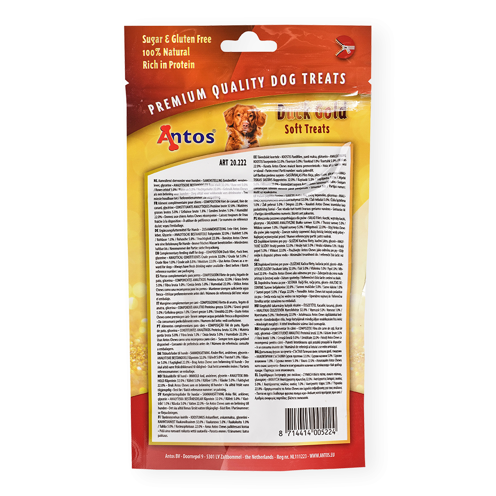 Gli Antos Duck Gold sono deliziosi bocconcini naturali per cani che contengono vera anatra che contribuisce a mantenerne magra la muscolatura dell’animale. Queste prelibatezze naturali e prive di cereali sono un complemento perfetto per il cibo secco o in scatola per cani.
