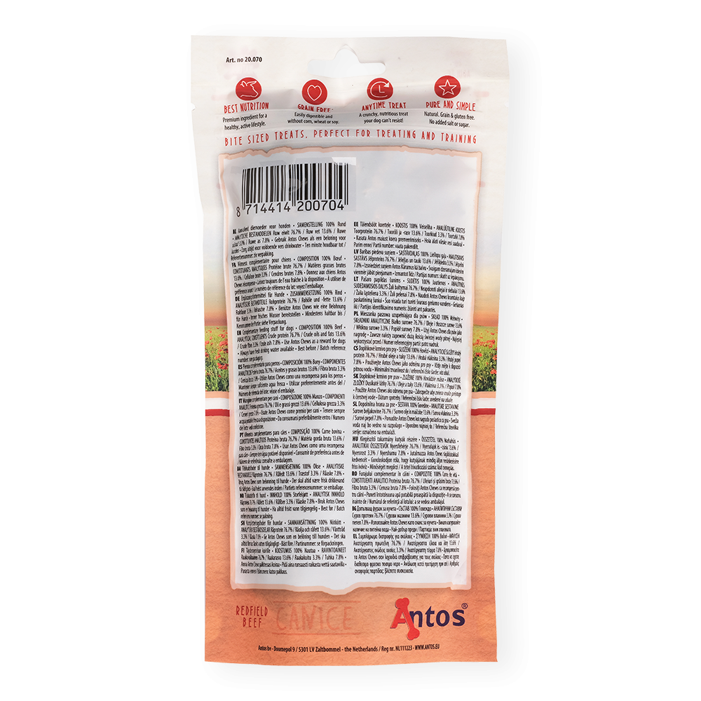 Dai al tuo cane la merenda naturale che si merita, dagli il nostro Canice Manzo ricco di proteine. Questi deliziosi bocconcini possono essere mangiati durante il pasto, gustati come topper o utilizzati per un trattamento sano o nel corso dell’addestramento. Realizzati con carne di manzo al 100%, hanno un gusto che il tuo cane amerà.