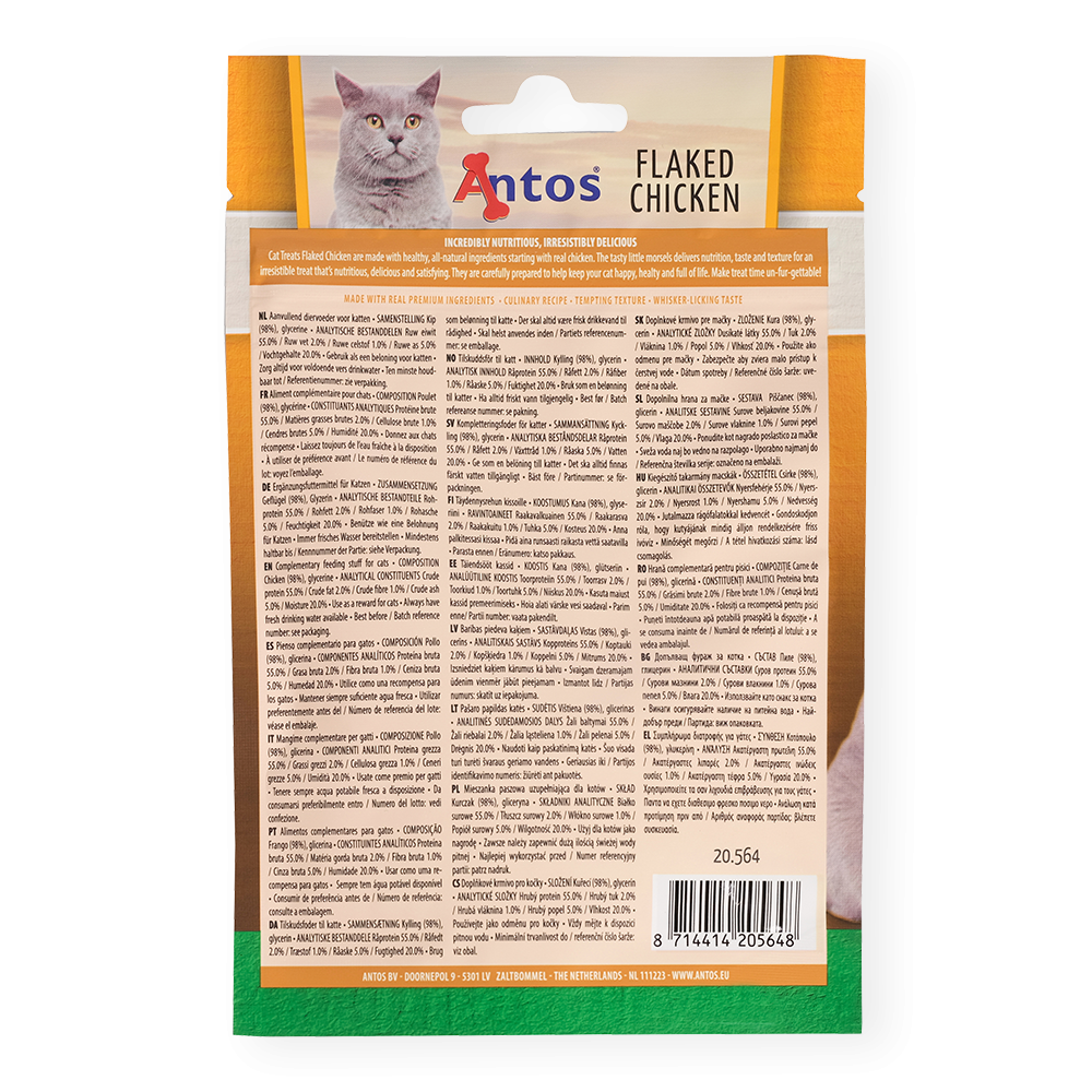 Regala al tuo amato pelosetto qualcosa che sia ripieno di bontà, i nostri Cat Treats Flaked Pollo. I bocconcini sono ripieni di vero pollo e contengono proteine di alta qualità, sostanze di cui il tuo gatto ha davvero bisogno. Hanno una consistenza liscia che lui amerà sicuramente e che gli farà fare le fusa.