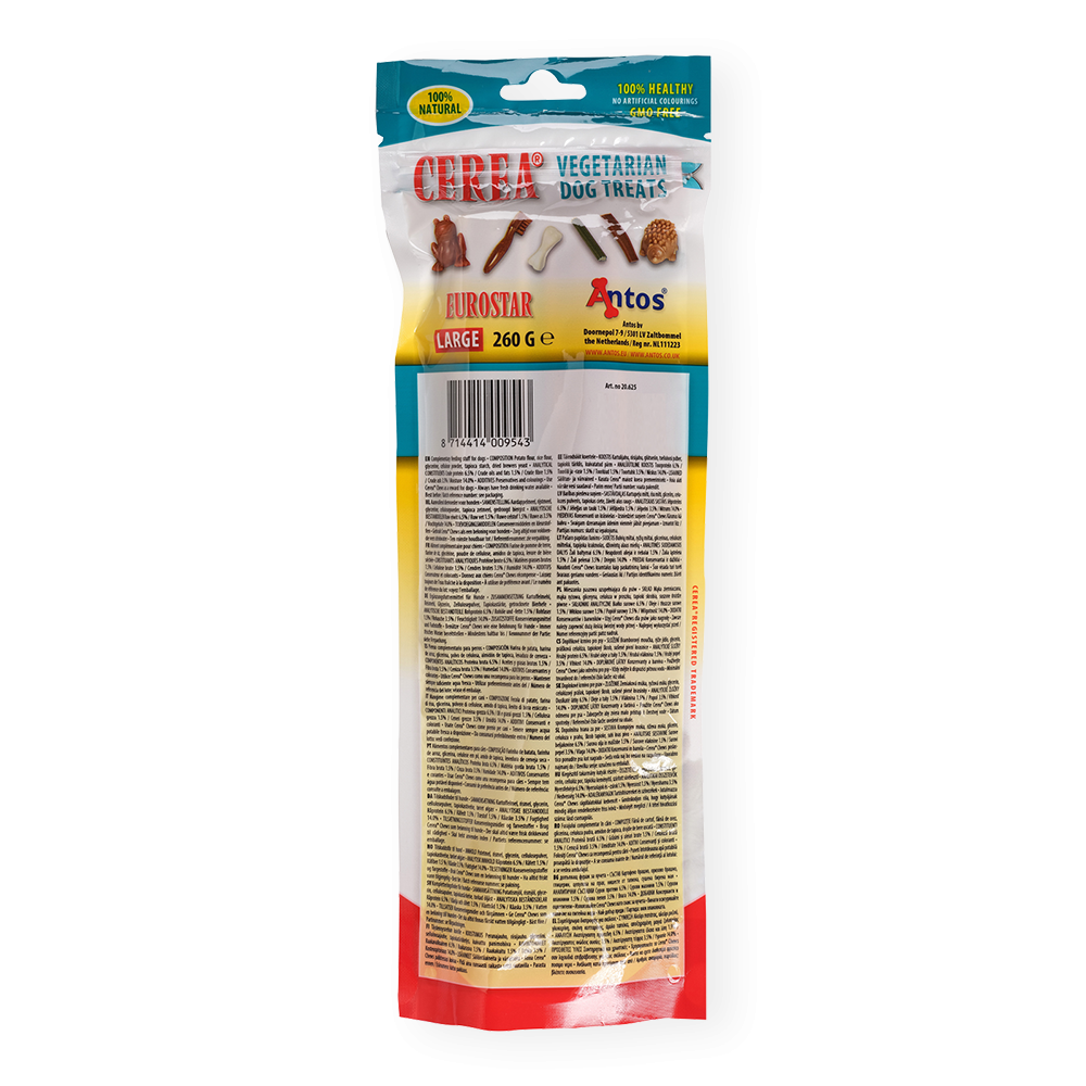 Un efficace trattamento dentale quotidiano non aiuta solamente a prevenire l'alito cattivo, ma contribuisce a garantire il benessere generale del tuo cane. I nostri articoli per la masticazione Cerea Eurostar hanno un sapore delizioso che il tuo cane amerà, e sono anche altamente digeribili.
