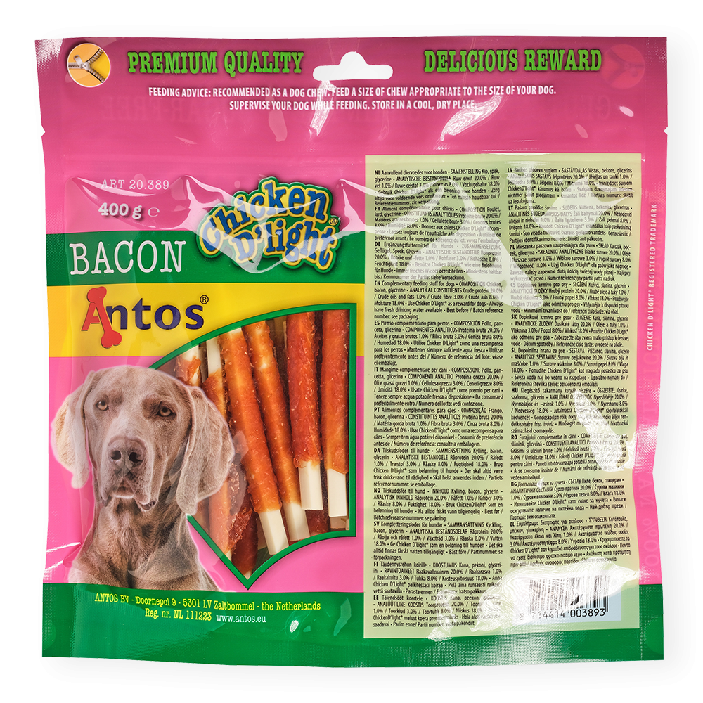 Il pollo super gustoso è avvolto intorno a un bastoncino di gommosa pancetta. Il tuo cane adorerà il sapore del Chicken D'light Bacon. Questi bocconcini facili da digerire e a basso contenuto di grassi sono molto piacevoli alla masticazione!