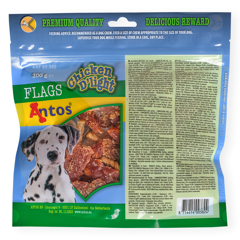 Lascia che sia il tuo cane a scegliere i suoi bocconcini, ma di sicuro apprezzerà le Chicken D'light Flags! Questa prelibatezza, originale, di classe e di qualità elevata, è realizzata con della tenera carne di petto di pollo avvolta intorno a un bastoncino anch’esso di pelle di pollo.