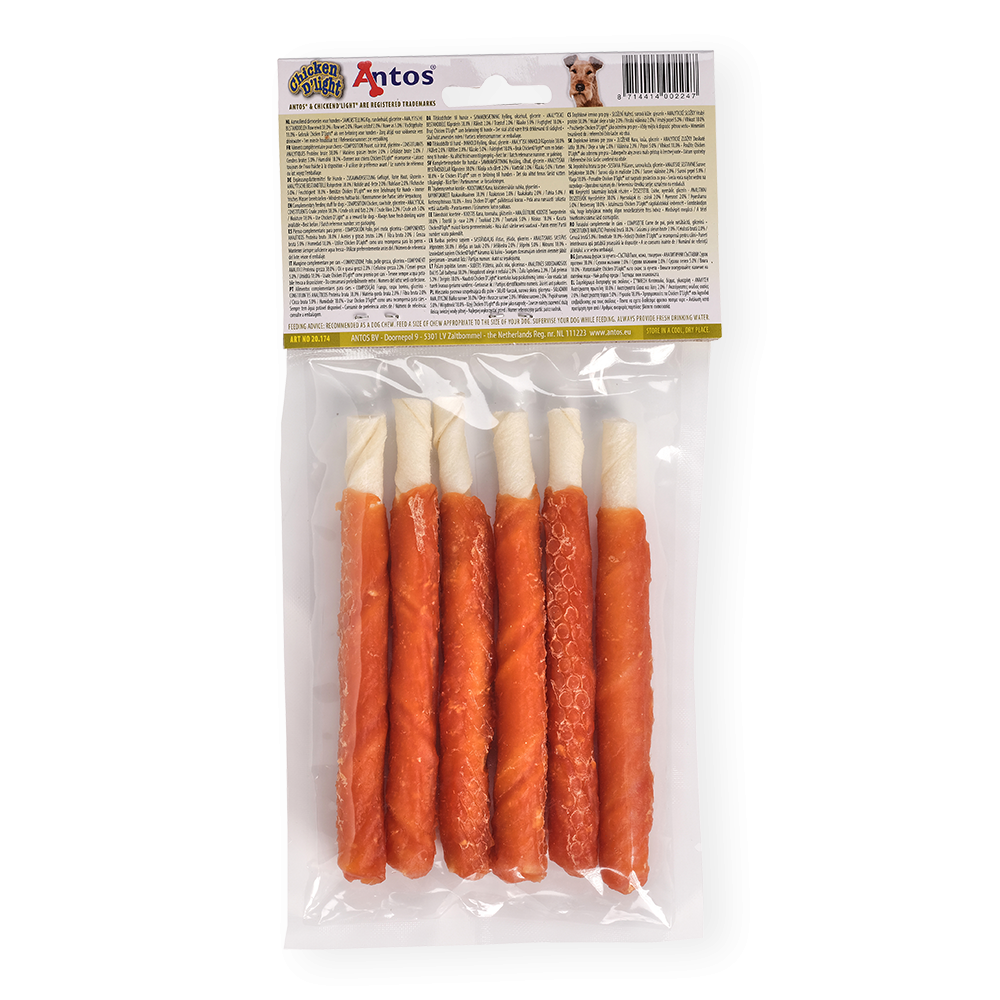 Gli ingredienti primari dei Chicken D'light Lollies sono il petto di pollo e la pelle di manzo. Sarai tranquillo se darai un lecca-lecca al tuo amico del cuore: è adatto come pensierino, come ricompensa oppure come strumento per l’addestramento.