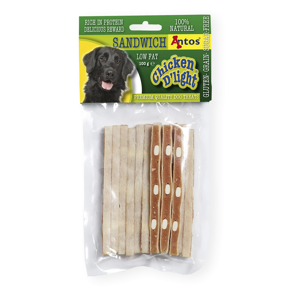 Realizzati anzitutto con pollo, prima ancora che con altri ingredienti quali pelle di merluzzo e formaggio, queste deliziose prelibatezze rendono più eccitante il momento del pasto. Vedrai come il tuo cane scodinzolerà di gioia con il Chicken D'light Sandwich!