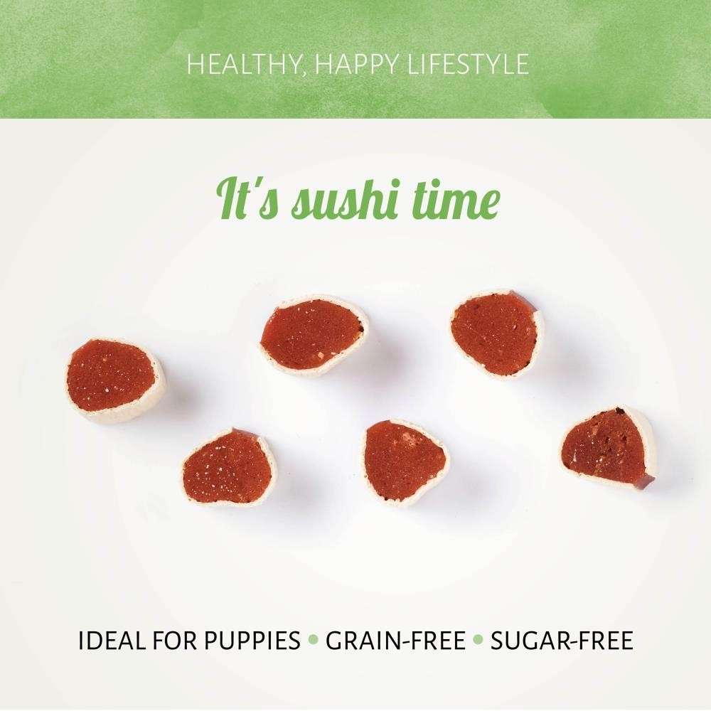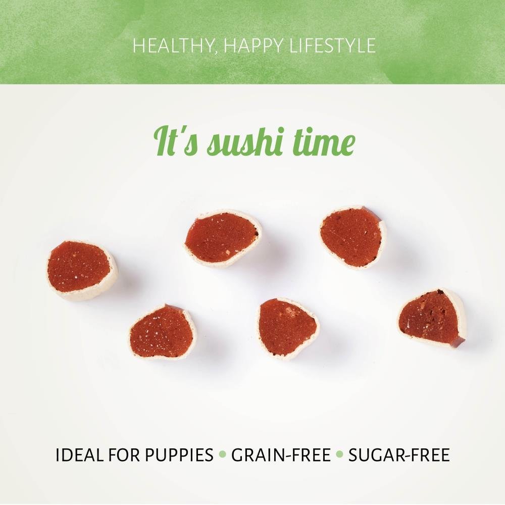 Sapevi che i cani possono mangiare il sushi? Il nostro Chicken D'light Sushi è un gustoso e divertente sushi pensato per i cani e realizzato con puro pollo avvolto sul merluzzo che è un pesce ricco di nutrienti. Incredibilmente deliziosi, questi bocconcini contribuiscono a mantenere la pelle sana e il pelo lucido del tuo cane.
