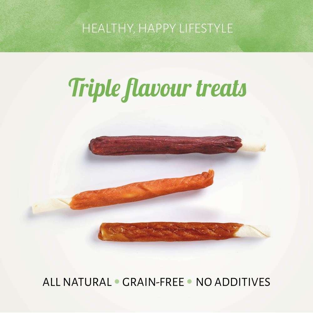 Fai divertire a lungo il tuo cane dandogli i nostri Finest Poultry Bâtonnets. Questi bocconcini sono realizzati con pelle di manzo premium avvolta in strati di delizioso petto di pollo, anatra salata e fegato di pollo. Tre sapori in un unico morso!