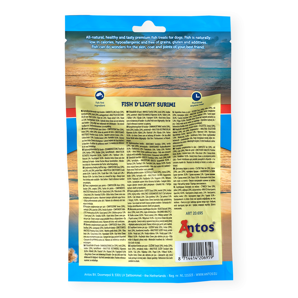 Aggiungi un po’ di bontà alla ciotola del tuo cane con il nostro Fish D'light Surimi. Si tratta di un consommé di granchio, con aggiunta di uno splendido tonno. È un alimento ricco di fosforo, di vitamine, e di omega essenziali che nutre la pelle dei tuoi meravigliosi cani. Una delizia nutriente, proprio l’ideale per i cani!
