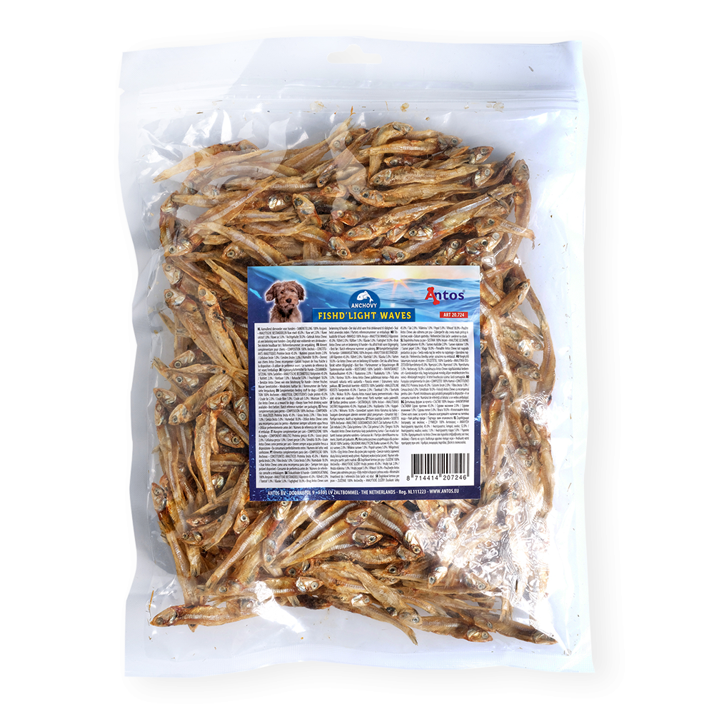L’acciuga è un pesce di piccole dimensioni, ma dai grandi benefici in termini nutrizionali. Il tuo amico peloso a quattro zampe potrà mangiarle in tutta sicurezza. Sono una fonte estremamente salutare di proteine, e ricche di acidi grassi omega 3; avranno un impatto positivo sul benessere del tuo cane, vedrai! Il tuo amico peloso adorerà masticare i croccantini per cani Fish D'light Waves, piccoli croccantini, ma dall’enorme appeal.