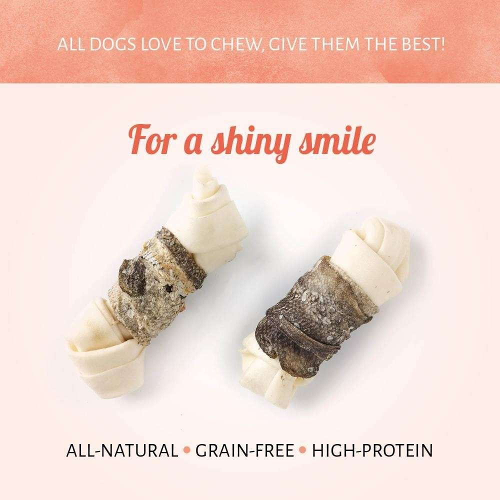 I Raw Hide White + Fish Knotted Bone sono il modo più gustoso per fare in modo che il tuo cane abbia un sorriso smagliante. L'atto di rosicchiare e la masticazione che dura più a lungo contribuiranno alla salute dei denti delle gengive del tuo cane, perché l’igiene orale è fondamentale.